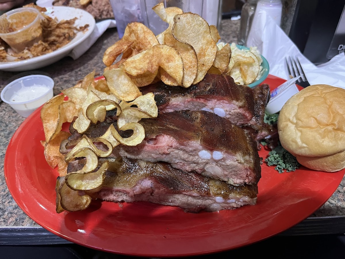 The wait Staff was quick and friendly. The Mac n cheese was a little soupy today, I didn't care for the taste of brisket, sausage was good, ribs were okay. Ham n cheese sandwich I wanted extra light onions got a lot, just wiped off and ate. It had good flavor. The waggs fries- potato chips were really cool and good! Try those!