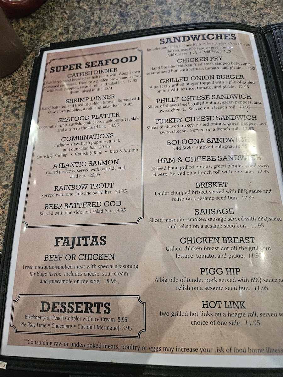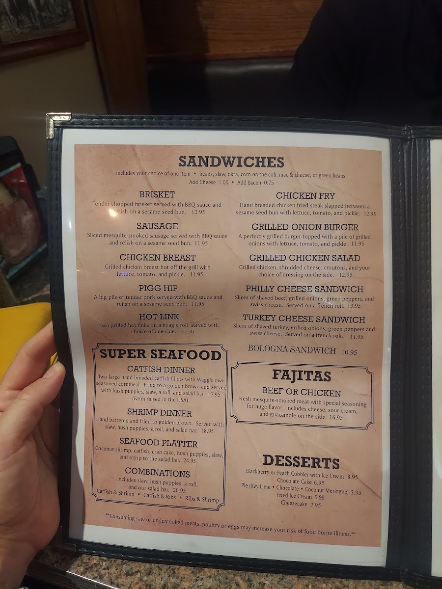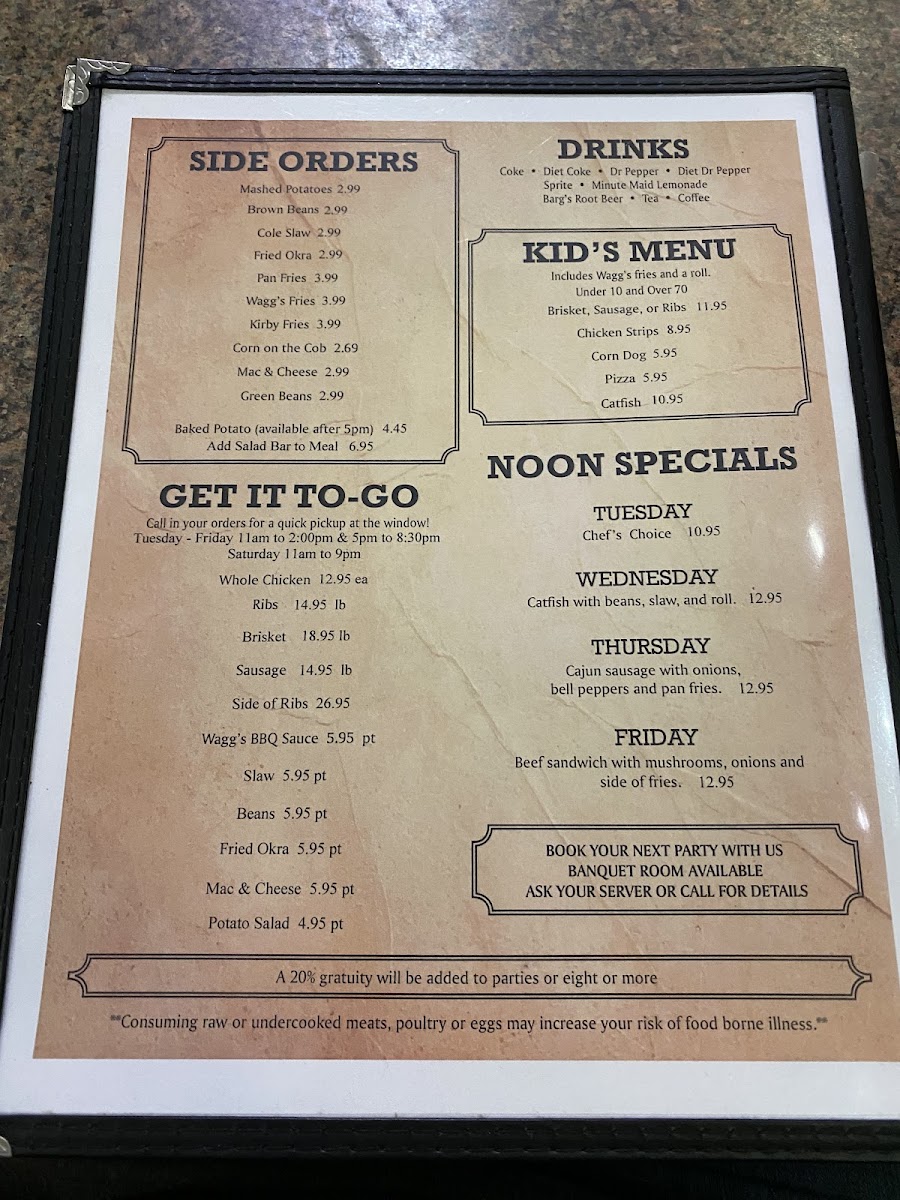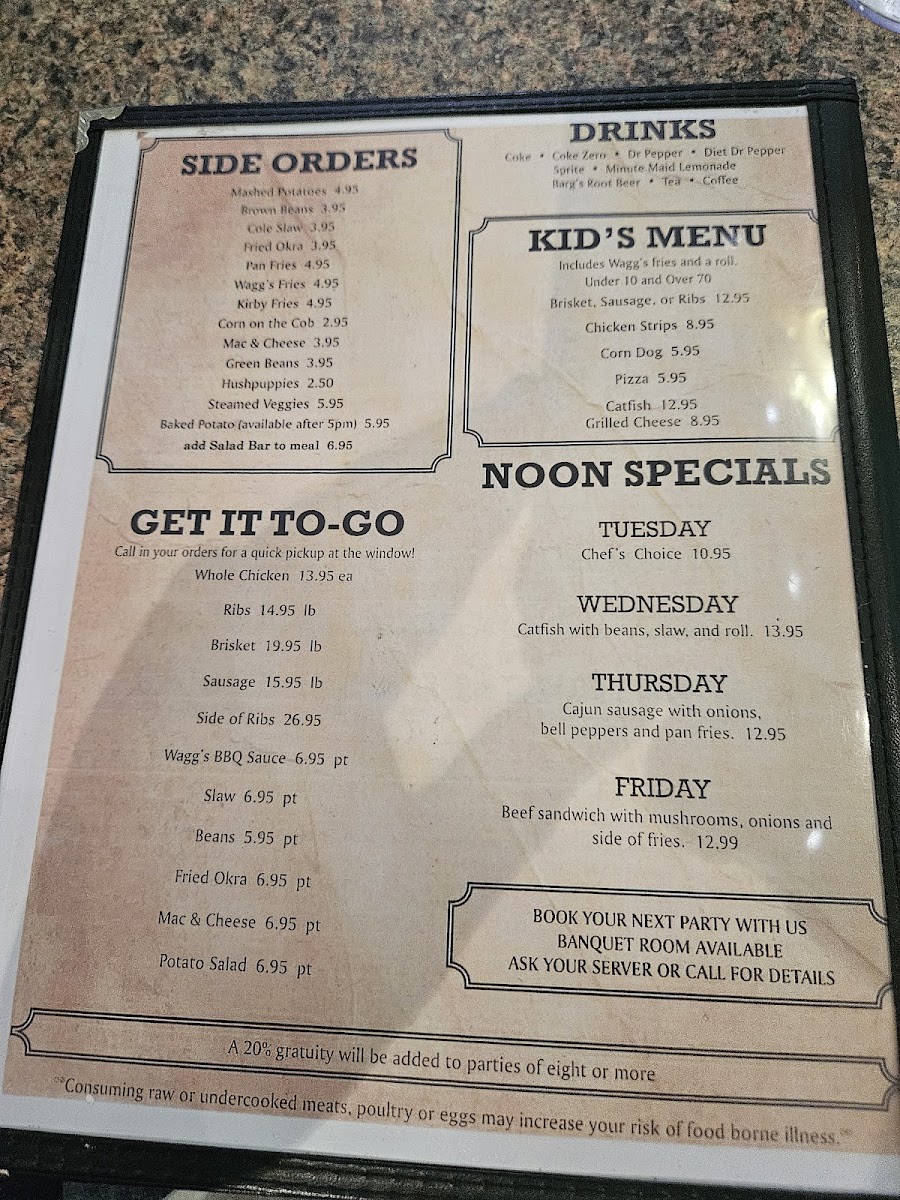 Wagg's Bar-B-Q offers a straightforward, comforting menu that feels right at home in its warm, casual setting. The focus is on hearty, satisfying barbecue classics and traditional sides that invite relaxed gatherings and familiar flavors. Whether you’re stopping by for a midday meal or settling in for a laid-back dinner, the menu strikes a balance between generous portions and familiar comfort.
